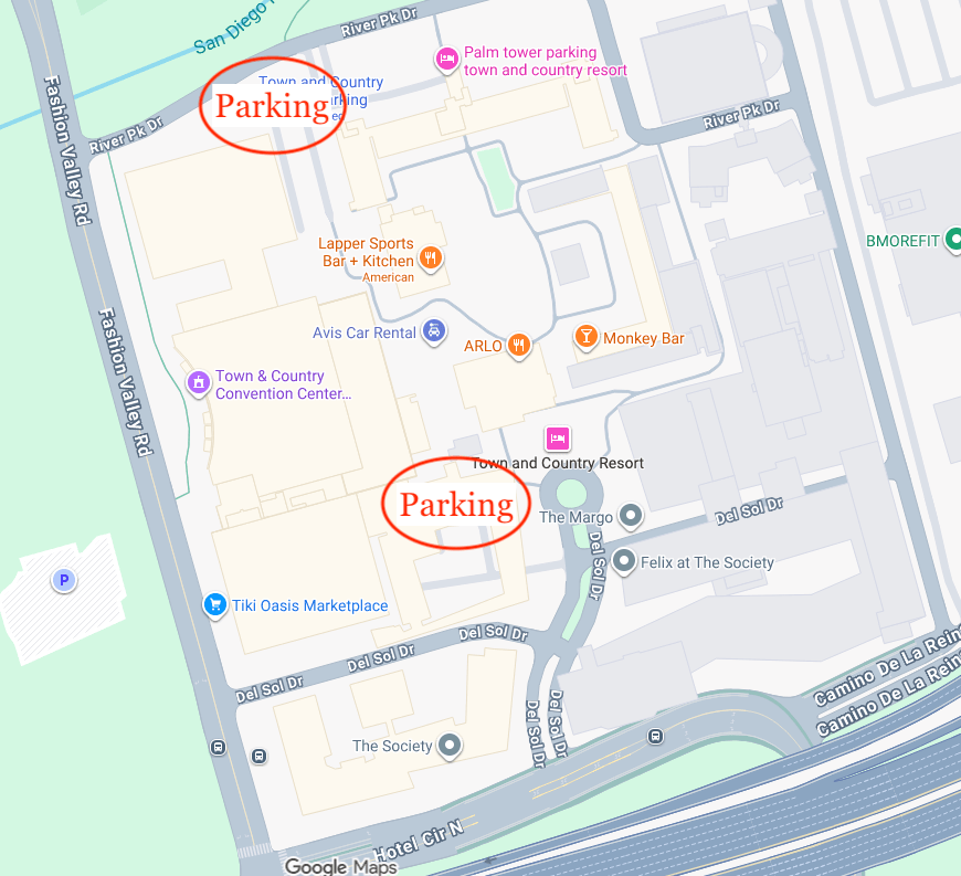 Parking is available at the Town and Country for $15 per day. There is parking accessible from the hotel entrance loop, as well as from River Park Drive.